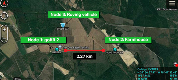 During the demonstration, the team utilized 9 goTenna Pro X radios in total, 4 of which were set as relays and placed in strategic points within and around the complex. The team utilized a goKit 2 at the demo tent which served as the network’s central command and control hub. The team also set up relays at a farmhouse located approximately 2.5 kilometers east of the demo tent as well as areas north of the demo tent. The demonstration lasted roughly 8 hours in total with continuous and uninterrupted connectivity throughout the entire duration.