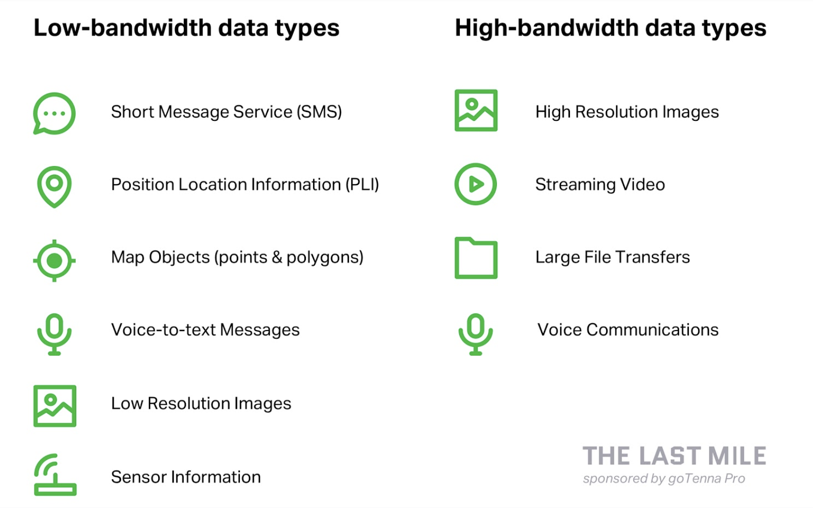 However, today’s mesh networking protocols are not always built to support the same size of data packet transmissions. Teams typically use a combination of high and low-bandwidth solutions to form a redundant PACE plan that meets specific mission needs. For example, a higher-bandwidth mesh networking radio could support a team lead’s voice communications back to command, while a lower-bandwidth radio device like goTenna Pro can transmit near real-time location information for every soldier in a common operating picture or app like ATAK.