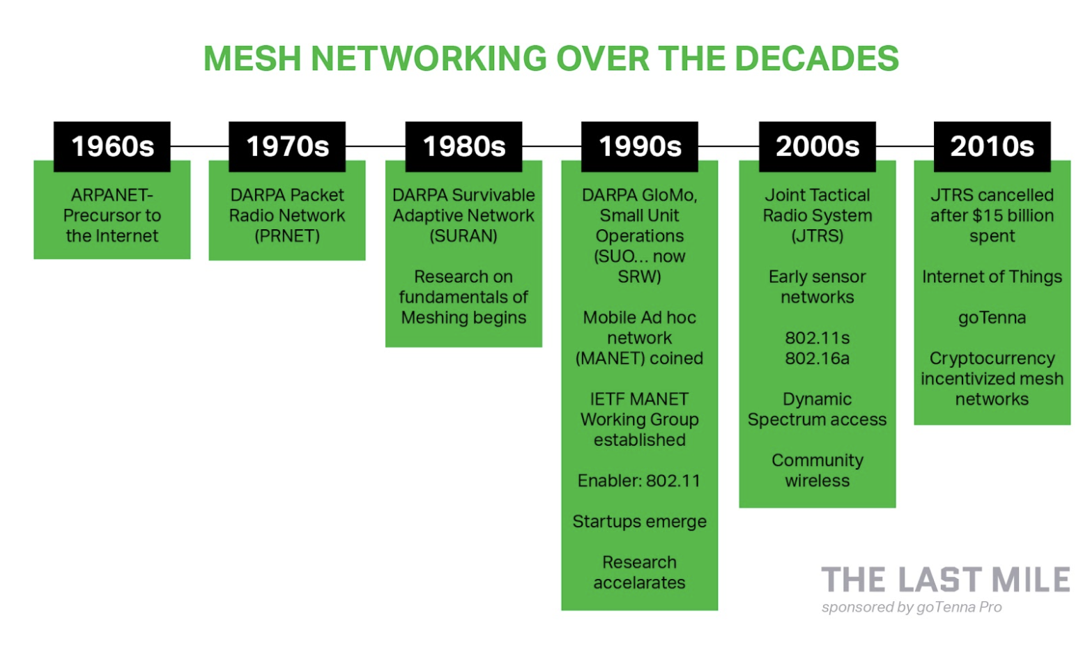 Mobile mesh networks provide device-to-device connectivity when centralized infrastructure is either unreliable or unavailable. Whether each network “node” is mobile or not, the defining features of mesh networks — decentralized, infrastructure-less, routing over multiple “hops” — have manifested themselves over the last several decades in different forms, for different applications, and by different names. Today’s mobile mesh networks have their roots in decades of U.S. military research and development.